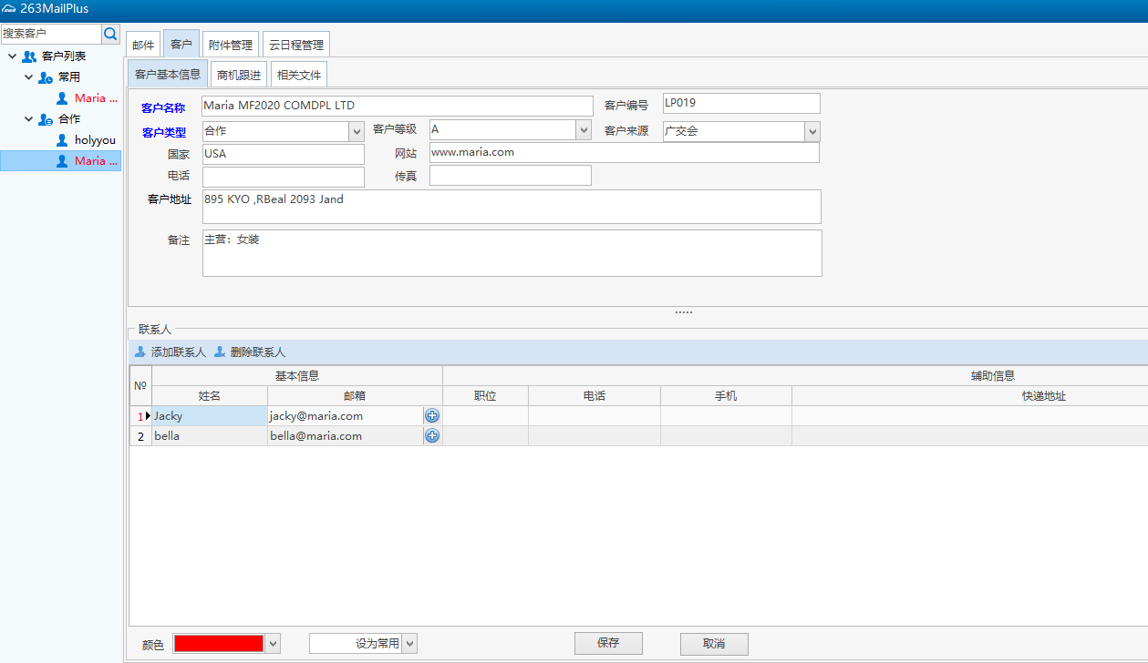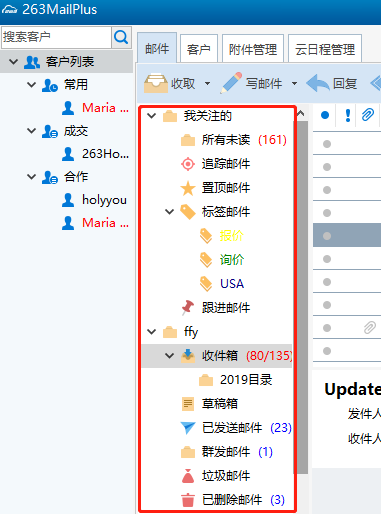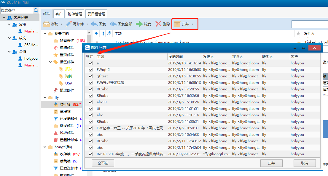 归并到客户下,收件箱是先判断发件人中的email地址,再判断抄送人中email地址,发件箱是按收件人email地址 ,如果这3个栏中有建立过客户资料的email地址, 该邮件就归并到客户目录下。