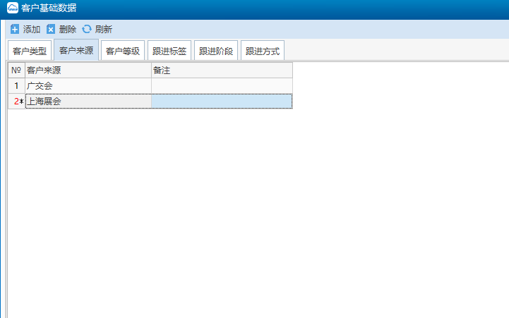 ●客户来源、客户等级、客户类型、跟进方式、跟进标签、跟进阶段等基础数据输入,如下图: