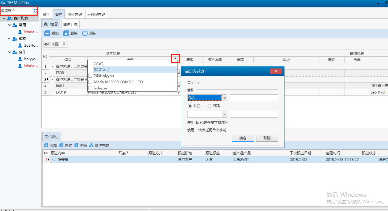 ●客户查询分二种,第一种快速查找客户,左上角搜索客户,输入客户名称或简称,可以直接定位到客户信息。第二种点列表小三角,可以跳出按客户名称或自定义查询,自定义查询如下图
