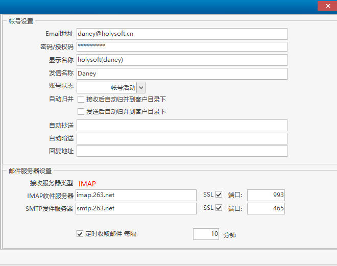点确定完成后:如下图,设置发信人名称,接收发送后归并,抄送,邮件备份天数等设置