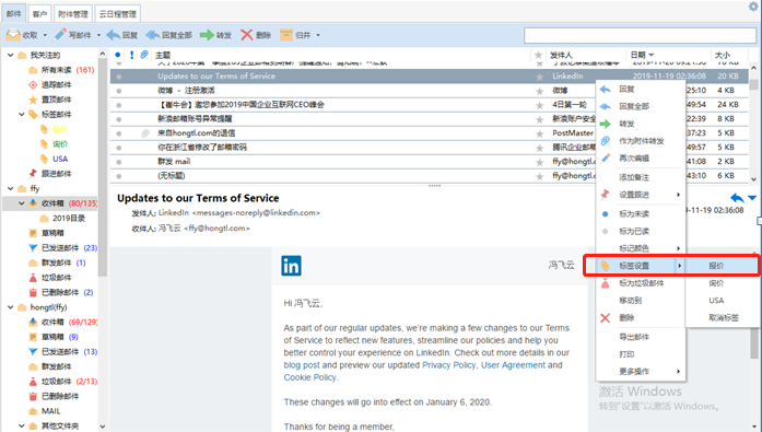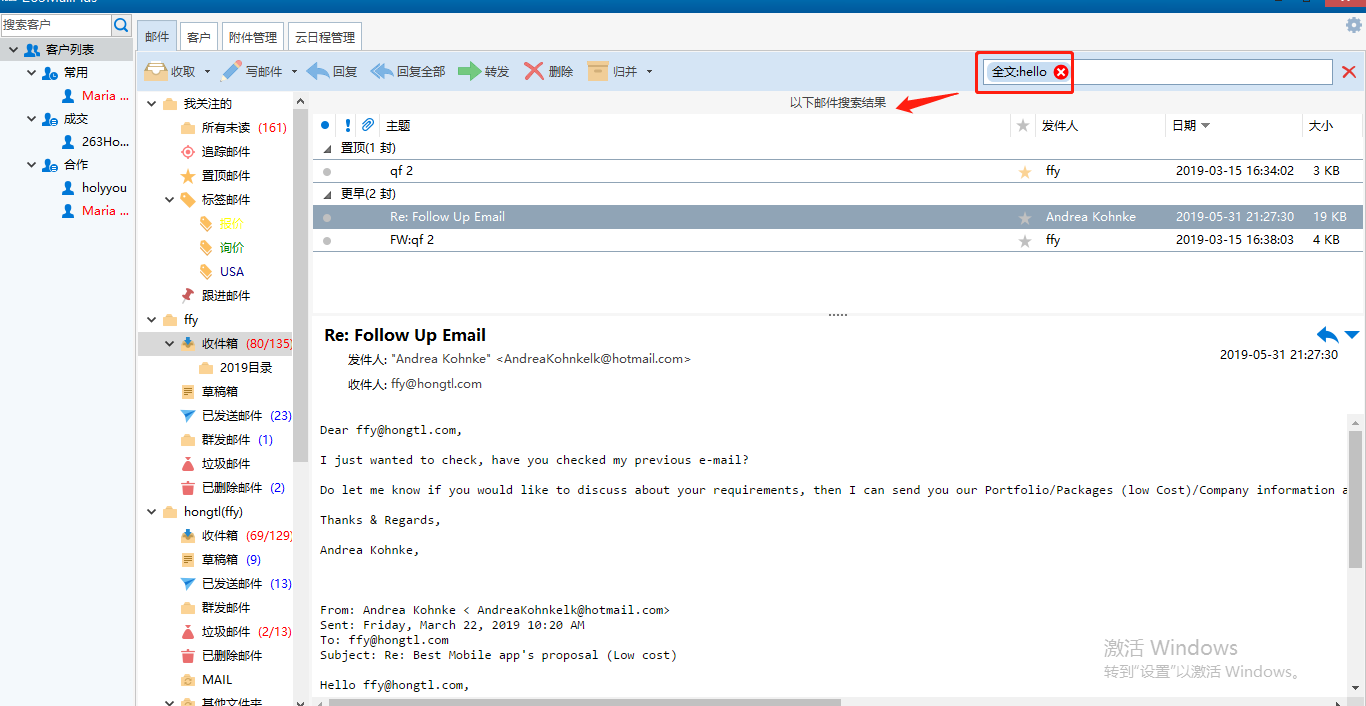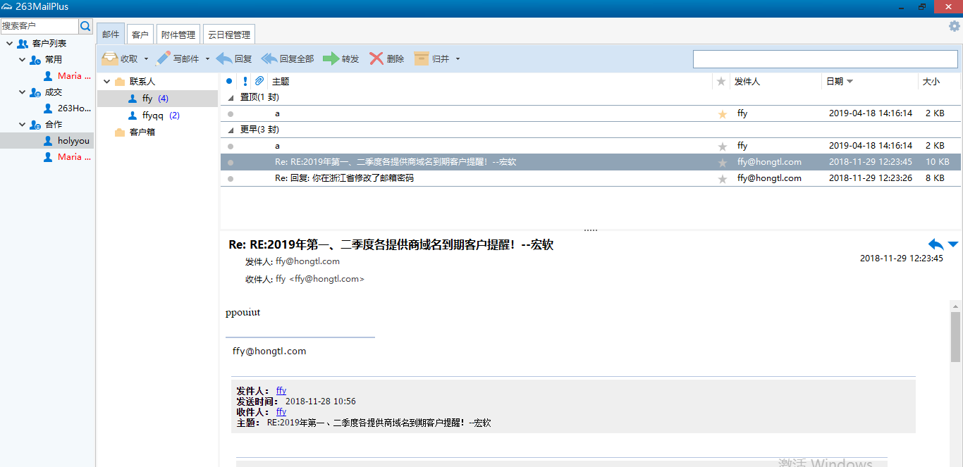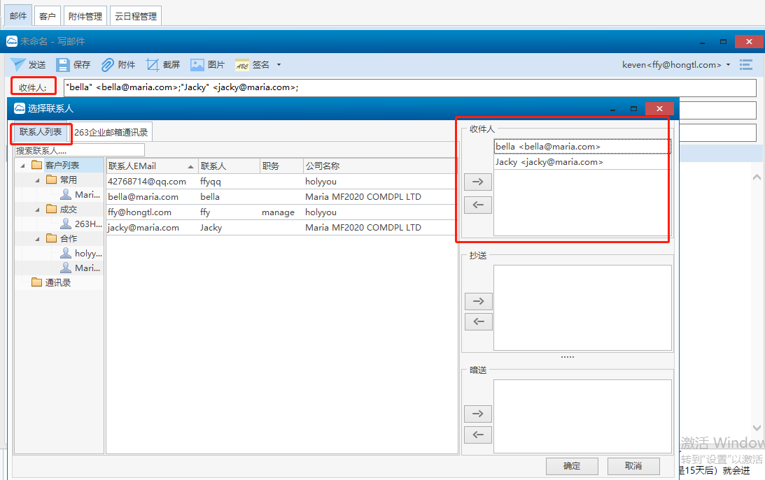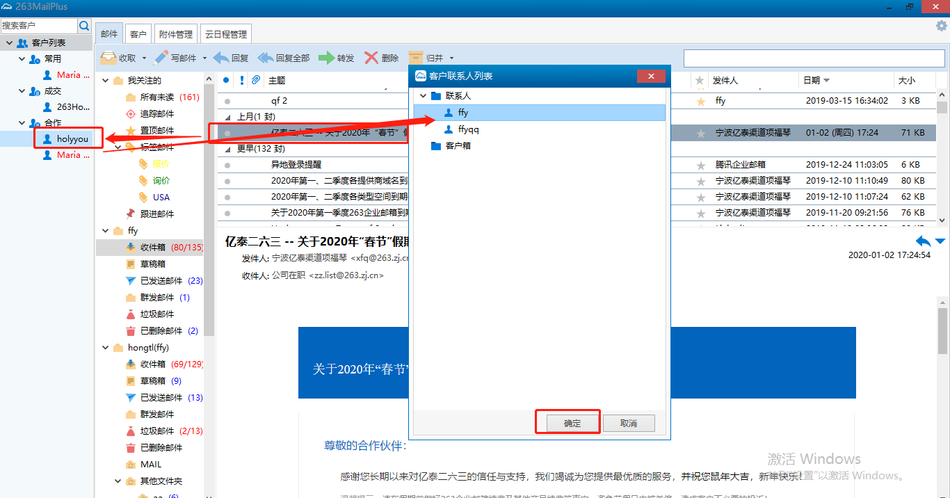 手动归并:拖动邮件移到客户名称上,如图,打开选择放到联系人下