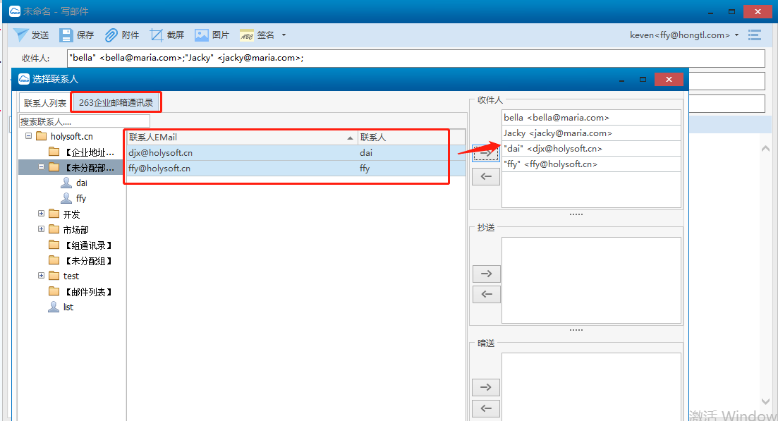 收件人:从263企业邮箱 通讯录选取,确定后加入到写邮件里的收件人框。如图