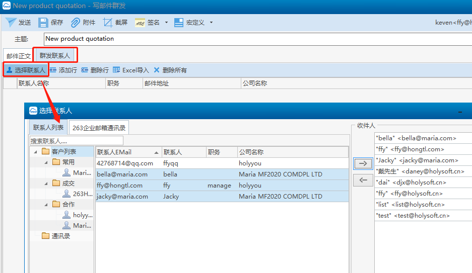 群发联系人选择: 可以在客户联系人、263企业通讯录选择,也可以通过Excel导入,添加行手动增加。如下图