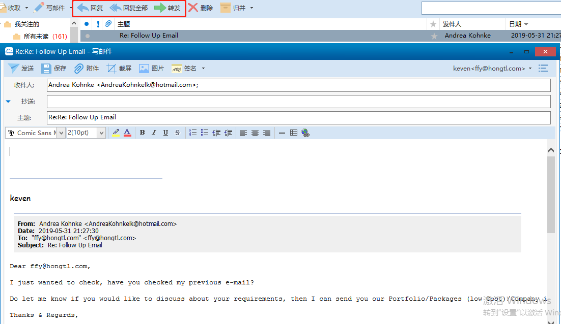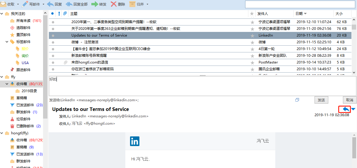 快速回复邮件,如下图,点击快速回复图标按钮,输入回复内容,点发送。