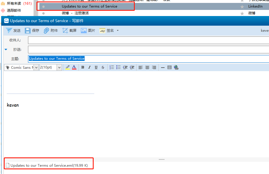 附件:添加文件到邮件附件发送,另外一种是直接在桌面把文件拖拉进邮件正文内容中,自动会加入到附件,如图2