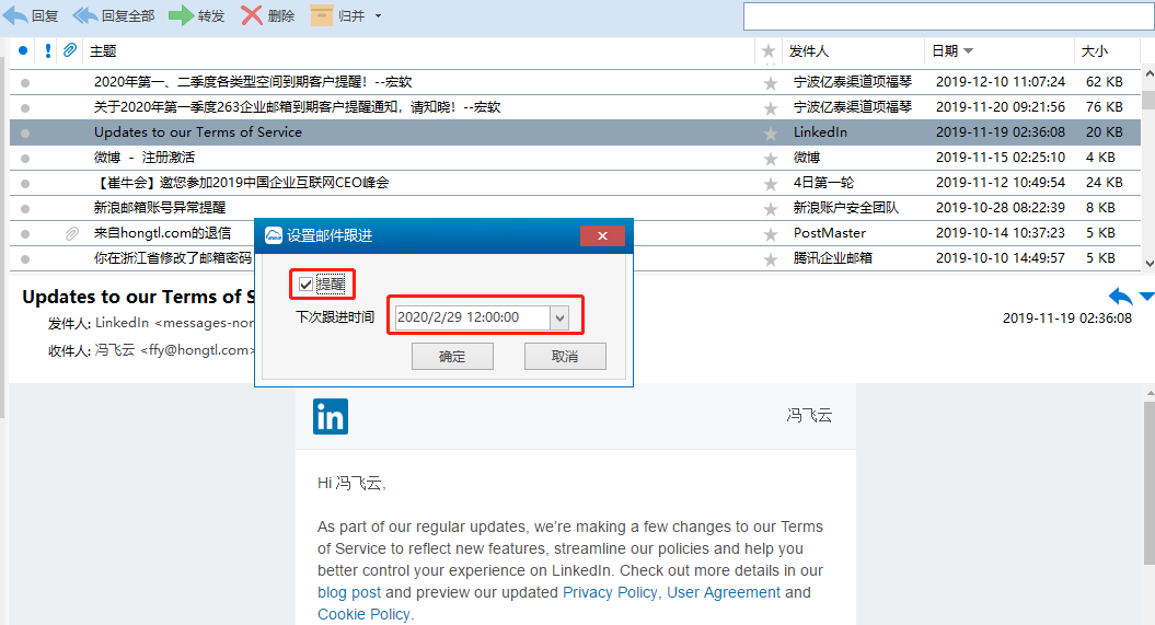 邮件跟进,选择邮件后,右击菜单跟进设置,勾上提醒,跟进时间,同时菜单里也可以取消跟进。