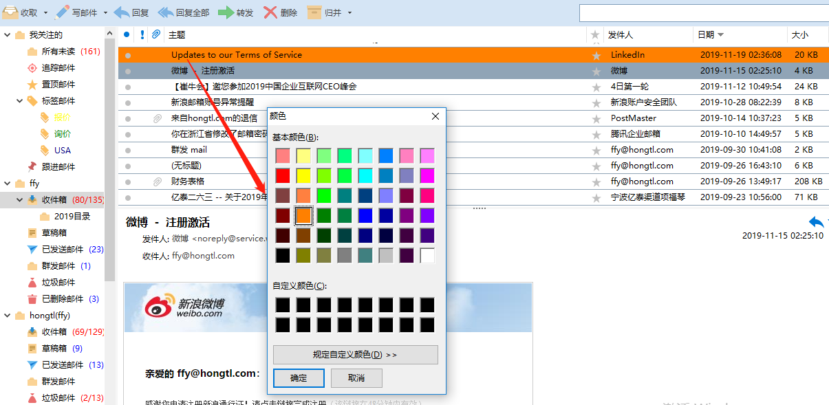 标记颜色:对重要的邮件可以标记颜色,右击邮件列表选择标记颜色,打开选择颜色选择框,确定。如图