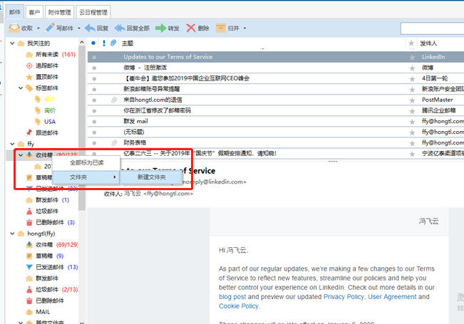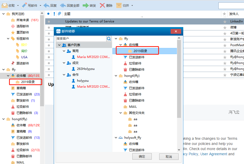 移动邮件,列表中选择邮件后,右键移动邮件,打开窗口后可以选择某个目录。如图