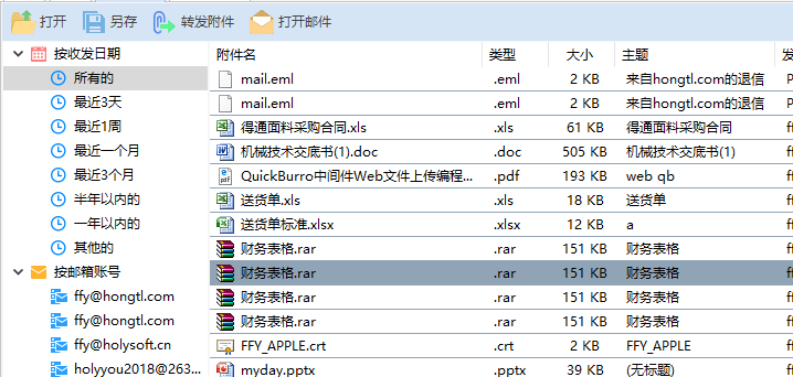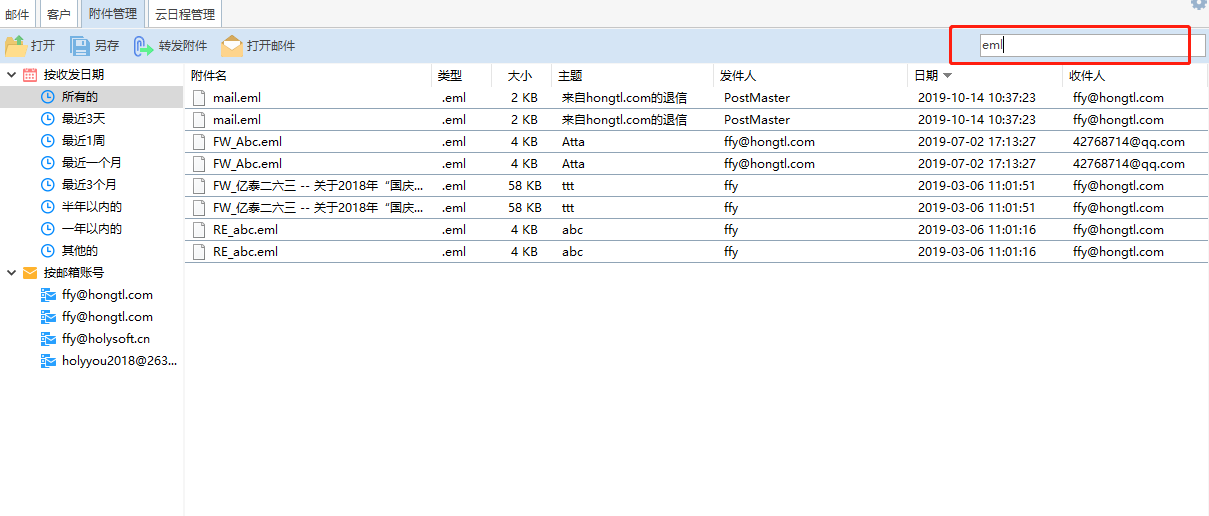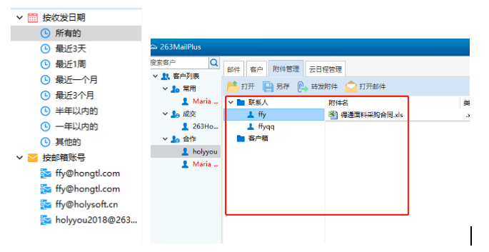 附件分类, 按收发日期,按邮箱帐号,选择客户后出现按客户的附件分类,如图